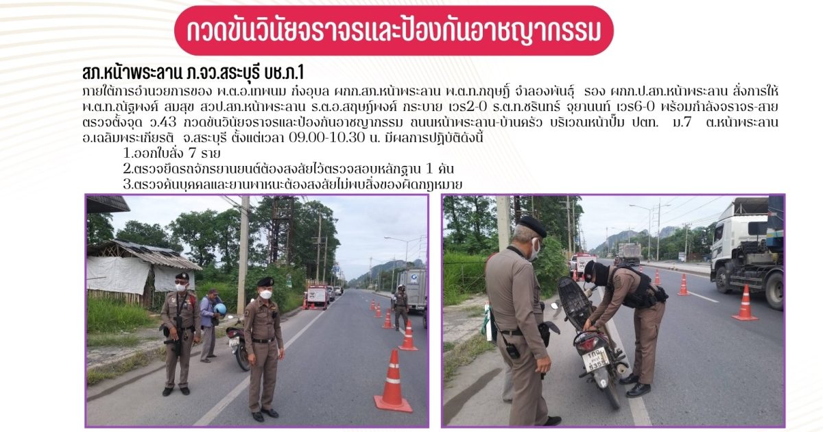 ตั้งจุด ว.43 กวดขันวินัยจราจรและป้องกันอาชญากรรม ถนนหน้าพระลาน-บ้านครัว บริเวณหน้าปั๊ม ปตท. ม.7 ต.หน้าพระลาน อ.เฉลิมพระเกียรติ จ.สระบุรี