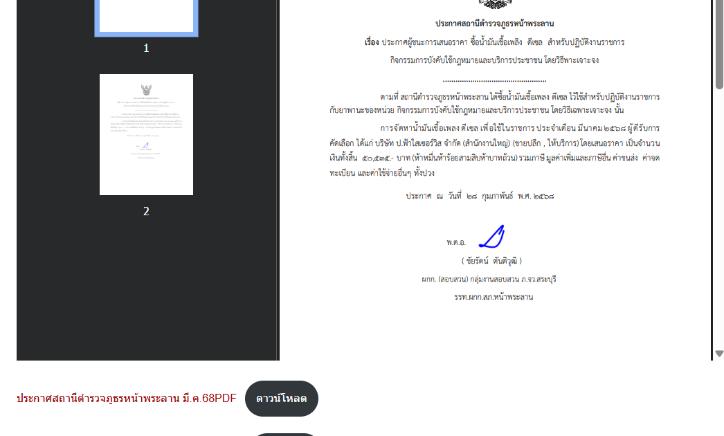 ประกาศผู้ชนะการเสนอราคา ซื้อน้ำมันเชื้อเพลิง เดือน มีนาคม 2568