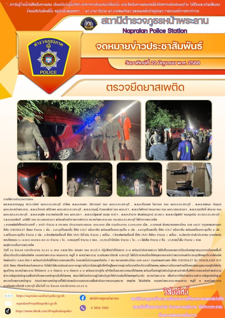 วันที่ 22 มิ.ย.68 เวลาประมาณ 22.25 น. ขณะ ร.ต.ต.วัชระ อ่อนตา รอง สว.(ป.)ฯ ปฏิบัติหน้าที่ร้อยเวร 2-0 พร้อมกำลังสายตรวจ ได้ขับขี่รถออกตรวจป้องกันเหตุอาชญากรรมในเขตพื้นที่ เมื่อมาถึงบริเวณโค้งเลิศจิต ถนนหน้าพระลาน-หนองจาน หมู่ที่ 8 ต.หน้าพระลาน อ.เฉลิมพระเกียรติ จ.สระบุรี ได้มีประชาชนเรียกให้หยุดรถและแจ้งว่าพบรถยนต์ประสบอุบัติเหตุบริเวณโค้งเลิศจิตดังกล่าว ร.ต.ท.วัชระฯ พร้อมกำลังจึงได้ไปตรวจสอบพบเป็น รถยนต์นั่งส่วนบุคคลไม่เกิน 7 คน หมายเลขทะเบียน 5กข 6837 กรุงเทพมหานคร ยี่ห้อ CHEVROLET รุ่น TRAILBLAZER SUV 2DR สีแดง เสียหลักชนกับขอบทาง จึงได้นำไฟฉายส่องผ่านกระจกดูภายในรถไม่พบผู้ขับขี่หรือผู้โดยสารอยู่ภายในรถหรือบริเวณที่เกิดเหตุ แต่พบภายในรถคล้ายมีสิ่งของผิดกฎหมายอยู่จึงได้แจ้ง ศูนย์วิทยุ สภ.หน้าพระลาน ให้ร้อยเวร 3-0 ร้อยเวร 4-0 ร้อยเวร 6-0 พร้อมอาสากู้ภัย เข้าปิดกั้นและตรวจสอบที่เกิดเหตุ พร้อมทั้งแจ้งผู้บังคับบัญชาตามลำดับชั้นให้ทราบและแจ้งเจ้าพนักงานตำรวจพิสูจน์หลักฐานเพื่อเข้าเก็บพยานหลักฐานในที่เกิดเหตุ ต่อมาได้รับแจ้งจากผู้บังคับบัญชาให้นำรถคันที่เกิดเหตุเข้ามายัง สภ.หน้าพระลาน เพื่อทำการให้เจ้าพนักงานตำรวจพิสูจน์หลักฐานตรวจเก็บพยานหลักฐาน ก่อนนำพยานหลักฐานที่ได้นำส่งพนักงานสอบสวนเพื่อดำเนินการตามกฎหมาย