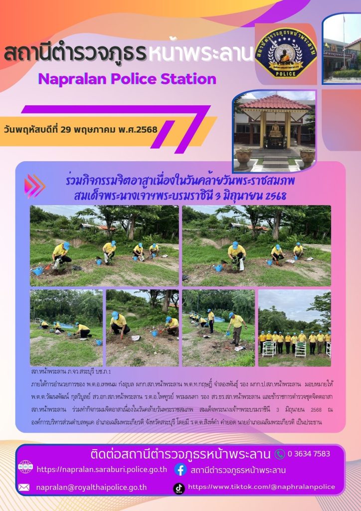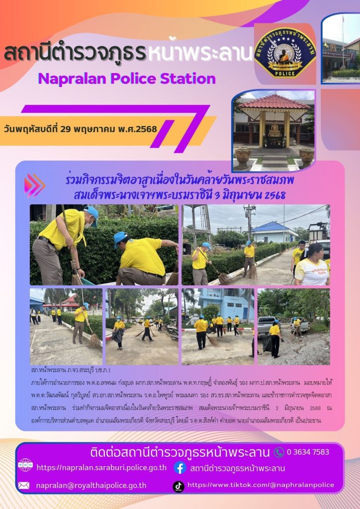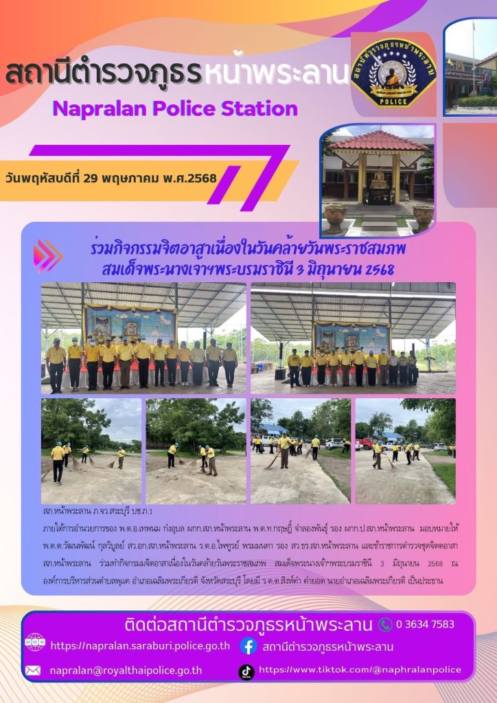 ภายใต้การอำนวยการของ พ.ต.อ.เทพนม ก๋งอุบล ผกก.สภ.หน้าพระลาน พ.ต.ท.กฤษฎิ์ จำลองพันธุ์ รอง ผกก.ป.สภ.หน้าพระลาน มอบหมายให้ พ.ต.ต.วัฒนพัฒน์ กุลวิบูลย์ สว.อก.สภ.หน้าพระลาน ร.ต.อ.ไพฑูรย์ พรมมนทา รอง สว.ธร.สภ.หน้าพระลาน และข้าราชการตำรวจ สภ.หน้าพระลาน ร่วมพิธีเจริญพระพุทธมนต์ เจริญจิตตภาวนา และร่วมกิจกรรม “ร่วมพลังสร้างสัปปายะสู่วัดด้วยวิถี 5 ส (Big Cleaning Day) โครงการวัด ประชา รัฐ สร้างสุข เพื่อเฉลิมพระเกียรติและถวายเป็นพระราชกุศล เนื่องในโอกาสวันเฉลิมพระชนมพรรษาสมเด็จพระนางเจ้าฯ พระบรมราชินี 3 มิถุนายน 2568 ของเทศบาลตำบลหน้าพระลาน อ.เฉลิมพระเกียรติ จว.สระบุรี ณ วัดหน้าพระลาน