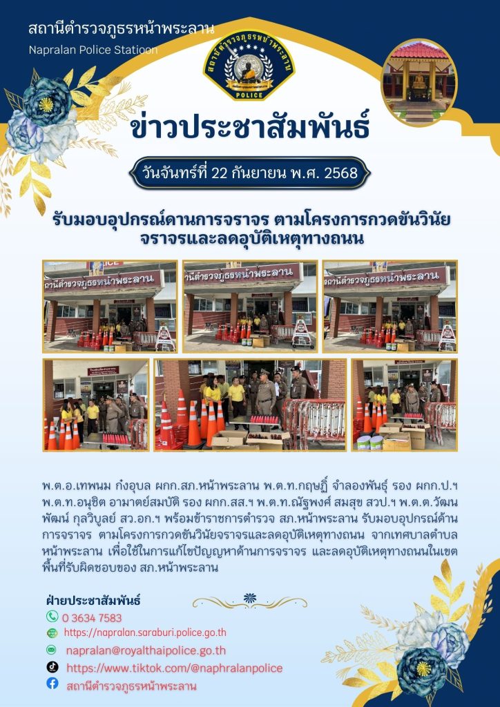 สภ.หน้าพระลาน ได้รับมอบอุปกรณ์ด้านการจราจร ตามโครงการกวดขันวินัยจราจรและลดอุบัติเหตุทางถนน