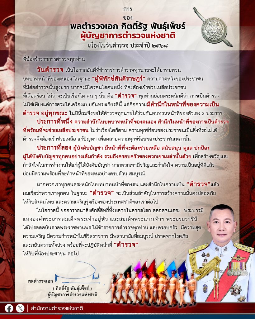สารของ พลตำรวจเอก กิตติ์รัฐ พันธุ์เพ็ชร์ ผู้บัญชาการตำรวจแห่งชาติ เนื่องในวันตำรวจ ประจำปี 2568