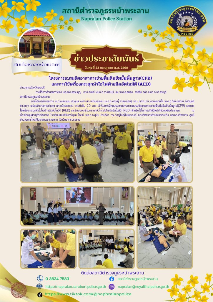 โครงการอบรมจิตอาสาการช่วยฟื้นคืนชีพพื้นฐาน CPR และการใช้เครื่องกระตุ้นหัวใจไฟฟ้าชนิดอัตโนมัติ AED 25 กรกฎาคม 2568 โดย admin / ข่าวประชาสัมพันธ์,ข่าวกิจกรรม,ข่าวประชาสัมพันธ์,ข่าวประชาสัมพันธ์,ข่าวฝากประชาสัมพันธ์,ข่าวภารกิจผู้บังคับบัญชา Post Views: 45 FacebookFacebookXXLINELine
